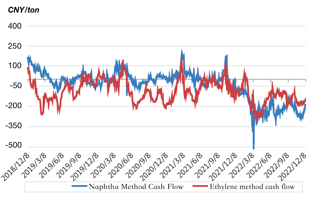 本周石脑油基乙二醇现金流继续亏损。截至周四,综合乙二醇即时现金为美元 184.23 /吨,周均现金流为212.13美元,较上周大幅增加。非综合现金流也有所回升。截至周四, 外部市场的即时现金流量约为 - 168.45 美元/吨,周均现金流量为- 163.21 元/吨。